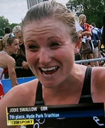 After the second transition, she got into a lead group of about 8 on the 10K run and hung on there until about 5K, at which point the British favourite Helen Jenkins moved away in a group of 4. Jenkins finished 3rd while Jodie and fellow Brit Vicky Holland scrapped it out for 6th and 7th place with Holland winning the duel. Jodie was officially timed at 34:50 for the 10K run, compared to 33:51 by the winner Findlay of Canada.