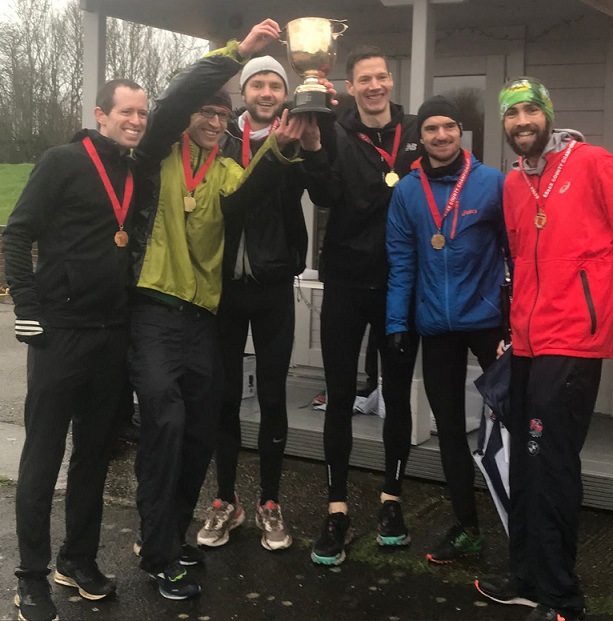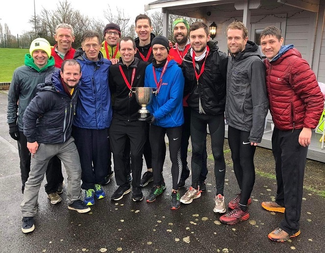 The men’s race took place to the backdrop of real-time team-score updates shouted by Paul Stockings; and the team was grateful for the firm and loud encouragement led by Bertie Powell, with Cowsi Magol, Alan Bird, and others, who braved the dispiriting and unrelenting Basildon rain and mud to support them. Afterwards, despite the rain continuing to pour, and pubs, lifts home and families calling, all 12 of the race-day squad stayed for the result to be confirmed, cheer our second-claim comrades at their medal and trophy presentation, and finally to hoist the trophy aloft, and get a glimpse of the history engraved on it.