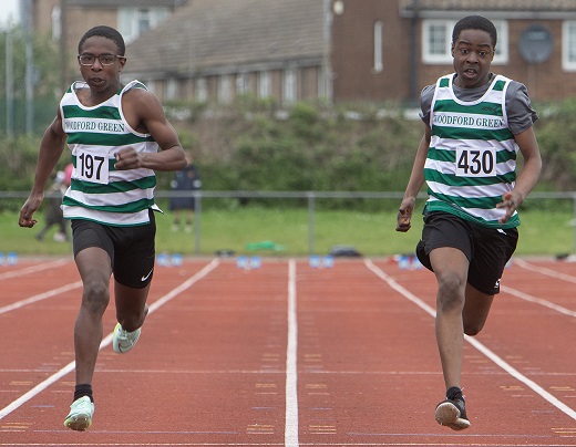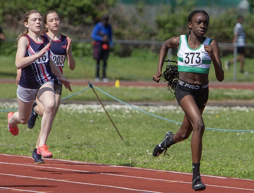 The short sprints event of 100m provided yet more PBs and medals. In the Under 20's men and women both Moyinoluwa Odeniran (men) and Gwendoline Datey (women) won their respective races with 10.85sec and 12.00sec. Marcel Winter, who continues to improve, was 1st in heat 2 with 11.02s, but bettered that time to record a sub 11 second time of 10.92s PB and finish 2nd. In the under 15 boys, Callum Clydesdale and Sammy Geist both ran. Callum was 3rd in heat 2 with 11.94s, a wind-assisted PB, and was 3rd in the final with a time of 12.00s. Sammy was 3rd in heat 1 with a time of: 12.49s. The under 15 girls were loaded with WGEL athletes and Caitlin Hancock led the way in heat 1 with 1st place in 12.75s, Nevaeh Johnson was 1st in heat 3 with 12.75s, Evanna Eze with 2nd in heat 3 in a new PB of: 13.01s and Ishana Malcolm was 6th in the same heat with a PB of: 13.82s. Zoe Hedges was 1st in heat 4: 13.13s, Remi Salako: 13.33s and 3rd whilst Abigail Osagie was 5th in the heat with a PB of 14.66s. In the semi final Caitlin was again 1st in 12.86s, Evanna was 2nd in 13.15s and Remi was 4th with 13.44s and Nevaeh was 2nd in other semi final but was Woodford's fastest with 12.67s. In the final Caitlin continued her winning ways with 1st place with 12.55s, Evanna was 4th in 13.19s and Remi was 6th with 12.27s. Unfortunately due to technical issues when her blocks slipped in the final Nevaeh (DNF).