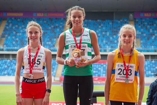 Nevaeh Johnson, coached by Gladys Bird, had a busy two days of competition. On the Saturday she placed 3rd in the 100 metres with 12.50. In the semifinal later that day, she just missed out on a place in the final with 12.38 for 3rd, which was a PB. In the 200 metres the following day, Nevaeh was 5th in the heat with 26.43. In the semifinal later that day she placed 8th in 26.83. It was a fine effort from Nevaeh in her first national championships.