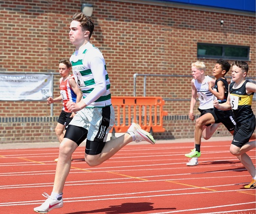 Now the throws, William Stander claimed a PB in the Shot Put with: 11m 66cm and 2nd, a 1st in the Hammer with: 46m 29cm and 3rd in the Javelin with: 38m 76cm. Cristian Scozzari was the b-string in shot and was 5th with: 7m 53cm and also b-string in Discus with: 12m 46cm and 6th, whilst James Simpson was a-string Discus and threw a new PB distance of: 15m 37cm for 6th and was 3rd in b-string Javelin with: 27m 23cm. Kian Traynor was the only other thrower who claimed a PB in the Hammer b-string with: 20m 58cm. The 4x100m relay team ( Tyler Reynolds, Sammy Geist, Callum Clydesdale & Alex Osagie) were in a very tough race but were still able to finish 3rd with: 47.81sec. The last event the 4x300m produced a CLUB RECORD time of: 2m 40.65sec when they finished 3rd the team being made up of: (Lucas Freedman, Toby Taylor, Daniel Niewczasinski-Kirkland & Rahul Solanki).